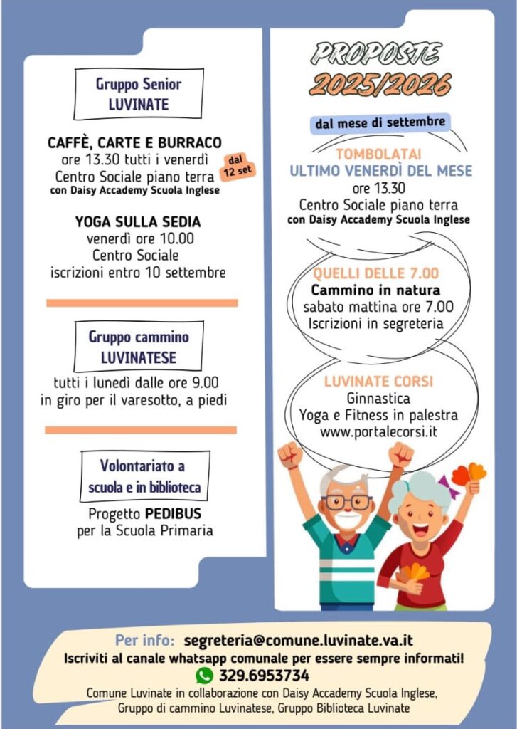 Le attività si svolgeranno nei locali al piano terra del Centro Sociale di Luvinate, grazie alla collaborazione con Daisy Accademy – Scuola d’Inglese, il Gruppo Biblioteca e il Gruppo di Cammino, sotto il coordinamento dell’Amministrazione Comunale.