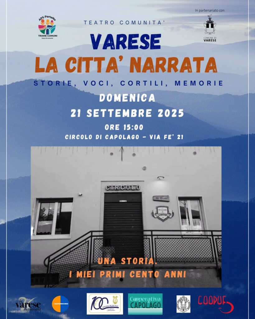 Continua il progetto “La Città Narrata”, promosso da APS ParteNo – Trame Comuni, in partenariato con il Comune di Varese, che celebra la storia dei quartieri varesini attraverso il teatro popolare. Domenica 21 settembre 2025, alle ore 15:00, il Circolo di Capolago (Via Fe’ 21, Varese) ospiterà lo spettacolo teatrale di comunità “Una storia. I miei primi cento anni”, in occasione del centenario della Cooperativa di Consumo tra Operai e Contadini di Capolago.