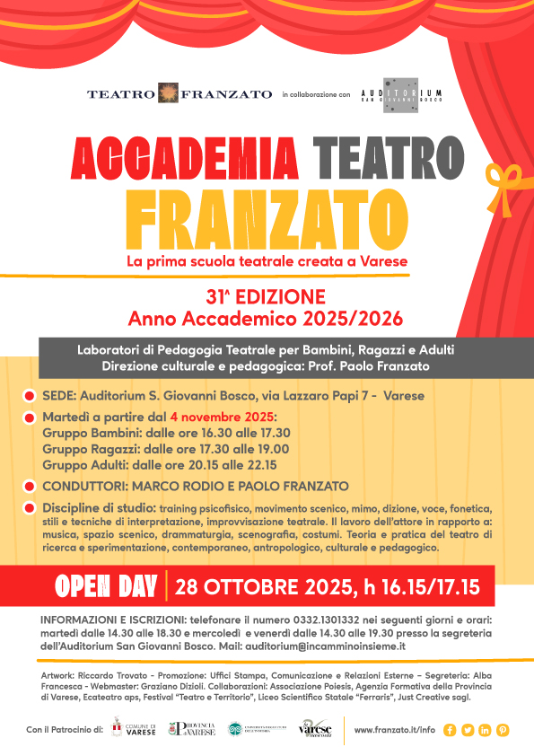 L’Accademia Teatro Franzato è realizzata con il patrocinio del Comune di Varese, della Provincia di Varese e dell’Università degli Studi dell’Insubria, e vedrà la direzione culturale e pedagogica del Prof. Paolo Franzato.