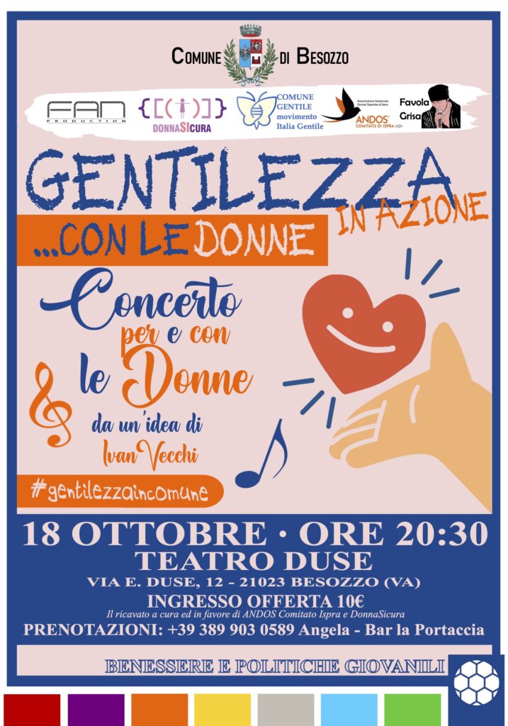 L’evento, intitolato “Gentilezza… con le Donne in Azione” e nato da un’idea di Ivan Vecchi , si terrà al Teatro Duse alle ore 20:30. L’iniziativa rientra nel percorso civico sulla “Gentilezza” ed è organizzata in collaborazione con il Comune di Besozzo, Fan Production, Alex Silipo Production, e le fondamentali associazioni ANDOS Comitato Ispra e Donna Sicura Travedona Monate.