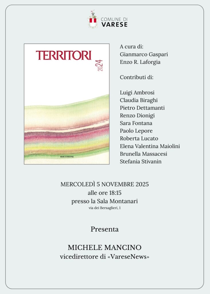 Mercoledì 5 novembre alle ore 18.15 la Sala Montanari di Varese ospita la presentazione del volume Territori 2024, edito da Macchione con la cura scientifica di Enzo R. Laforgia e Gianmarco Gaspari. Conduce la presentazione il giornalista Michele Mancino.