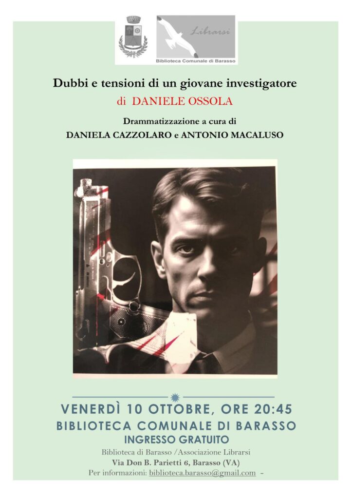 Una serata che unisce letteratura e teatro, per entrare nei pensieri di un giovane investigatore alle prese con i suoi primi casi. La Biblioteca Comunale di Barasso propone per venerdì 10 ottobre alle ore 20:45 un evento speciale: la presentazione del libro di Daniele Ossola, “Dubbi e tensioni di un giovane investigatore”.