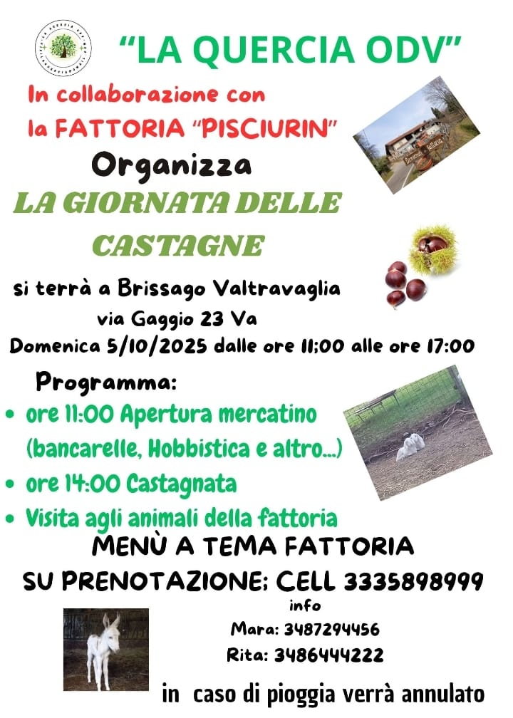 Si chiama “La Giornata delle Castagne” l’evento in programma per domenica 5 ottobre a Brissago Valtravaglia. Dalle 11 alle 17, l’agriturismo Fattoria Pisciurin ospita una festa dal sapore genuino, organizzata dall’associazione ODV La Quercia in collaborazione con la stessa fattoria.