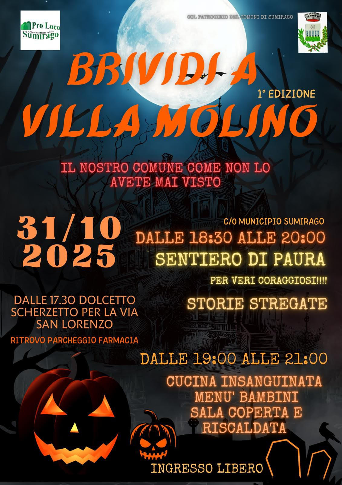 Venerdì 31 ottobre Il Comune di Sumirago si trasforma in una villa da brividi con dolcetto o scherzetto per le strade, percorsi da paura nel parco, attività e una cucina insanguinata