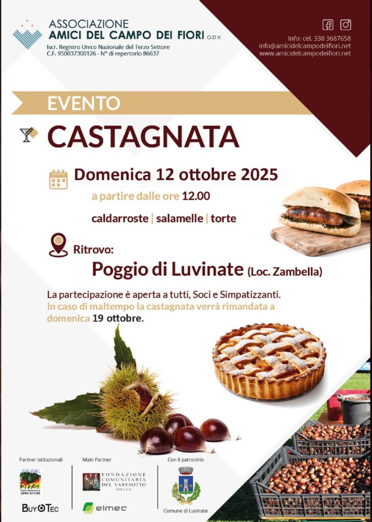 Domenica 12 ottobre 2025 il Poggio di Luvinate ospita la tradizionale castagnata organizzata dall’Associazione Amici del Campo dei Fiori. L’evento inizia a mezzogiorno e accoglie soci, simpatizzanti e amanti della natura per una giornata all’insegna del gusto e della compagnia.