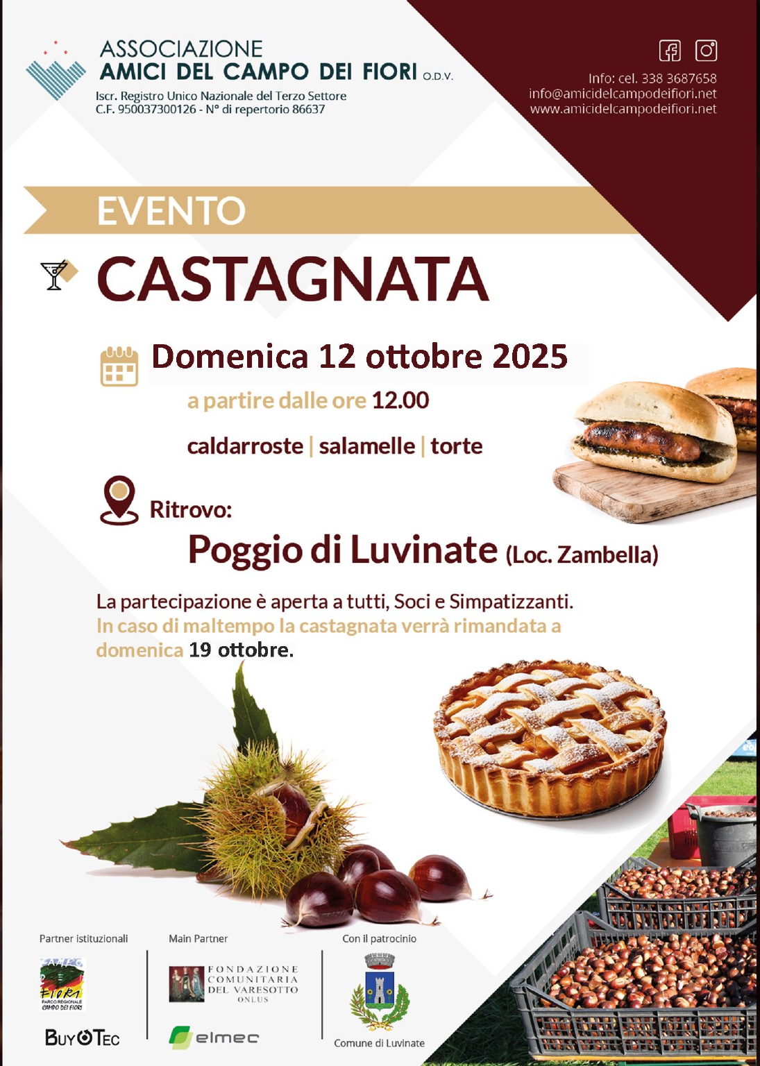 L’autunno si accende di profumi e sapori al Poggio di Luvinate, dove domenica 12 ottobre 2025, a partire dalle ore 12.00, si terrà la castagnata promossa dall’Associazione Amici del Campo dei Fiori ODV. L’iniziativa è aperta a tutti e offre l’occasione di gustare caldarroste, salamelle e torte in un contesto naturale suggestivo, immerso nel verde del Parco del Campo dei Fiori.