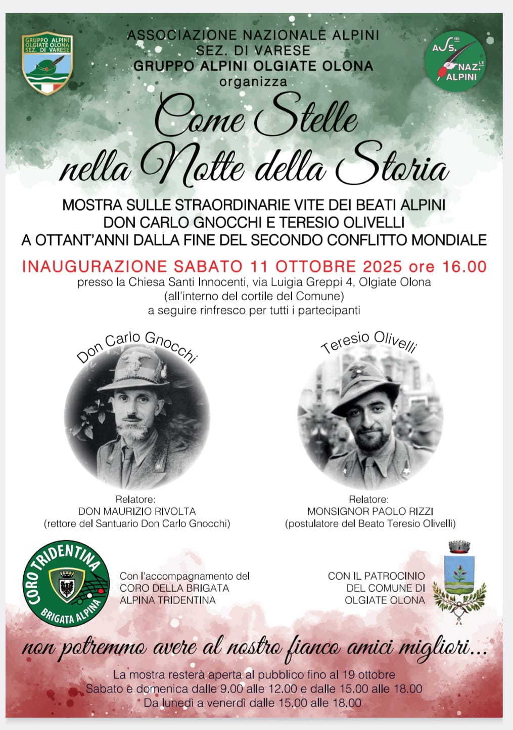 Olgiate Olona si prepara ad ospitare “Come Stelle nella Notte della Storia”, una mostra che racconta la vita dei beati don Carlo Gnocchi e Teresio Olivelli, due uomini che hanno dedicato la loro esistenza al servizio degli altri, specialmente dei più deboli e perseguitati. L’inaugurazione è prevista per sabato 11 ottobre 2025 alle 16.00 nella Chiesa Santi Innocenti in via Luigia Greppi 4 (all’interno del cortile del Comune).