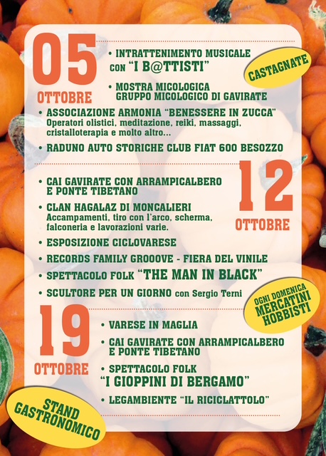 Il cuore della festa è la cucina: ravioli, risotti, gnocchi, tortelli, secondi piatti e dolci, tutti rigorosamente a base di zucca. A completare l’offerta, i prodotti tipici della provincia di Varese e le specialità della Pro Loco, come frittelle e dolci mantovani.