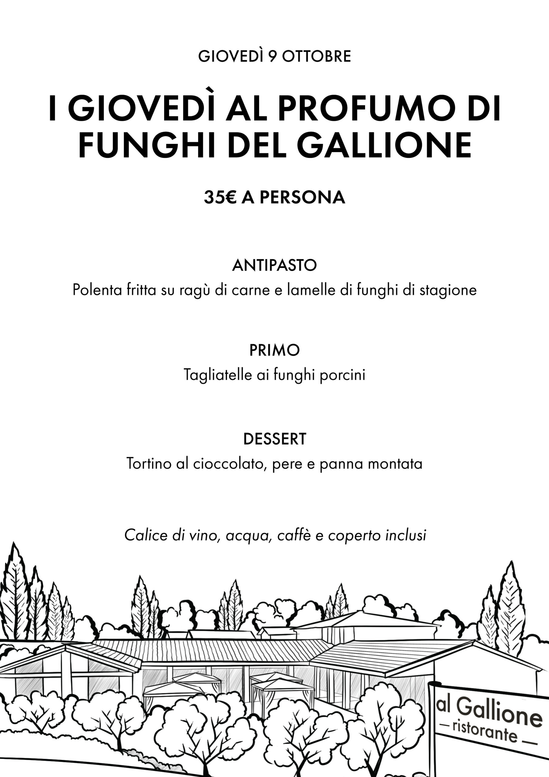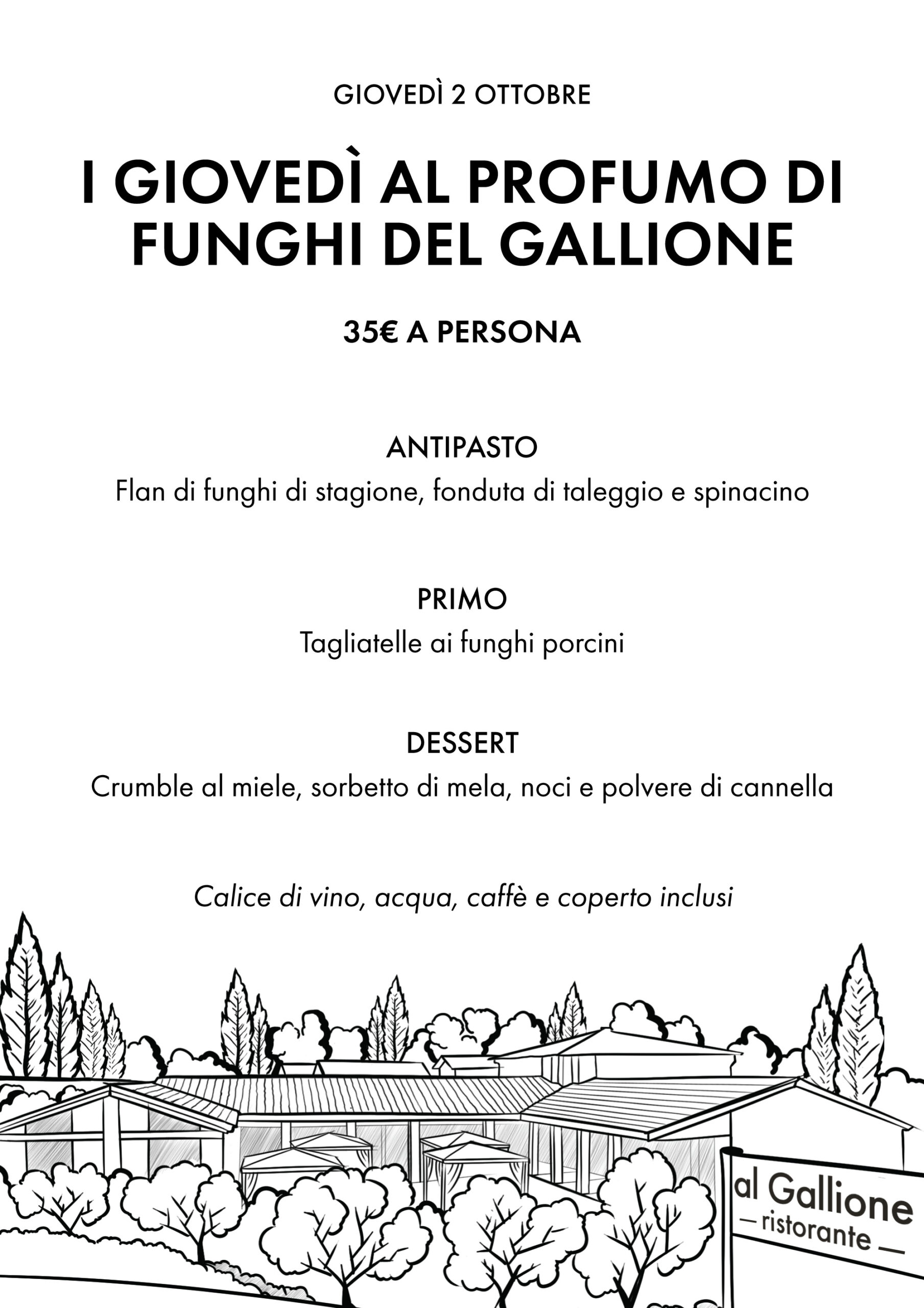 Per tutti i giovedì del mese (9, 16, 23 e 30 ottobre), la cucina propone un menu a prezzo fisso dedicato a chi ama la stagione dei funghi e le atmosfere più calde e raccolte che accompagnano l’inizio dell’autunno.