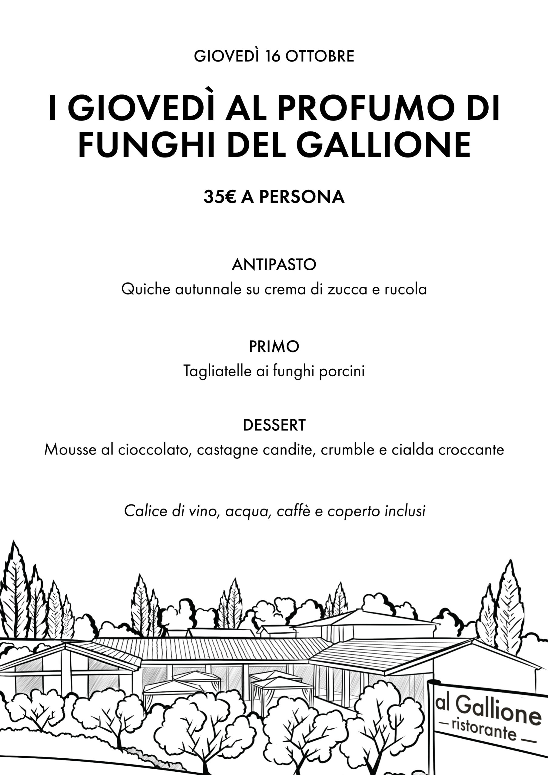 Il ristorante Al Gallione inaugura l’autunno con i “Giovedì al profumo di funghi”: ogni settimana un menu fisso a 35€ con tagliatelle ai porcini come piatto principe, antipasto e dessert sempre diversi, vino e caffè inclusi