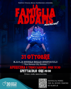 Per la notte di Halloween, M.Art.E – Scuola dello spettacolo, invita bambini, famiglie e ragazzi a vedere La Famiglia Addams, il musical interpretato dagli allievi dei corsi Musical adulti e Musical 4 kids, in scena proprio nella serata più dark dell’anno, venerdì 31 ottobre alle ore 21.30.