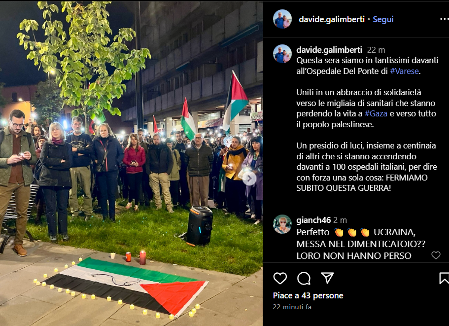 All’iniziativa “Luci sulla Palestina” all’Ospedale Del Ponte di Varese ha partecipato anche il sindaco Davide Galimberti, che in post su Instagram ha scritto: «Questa sera siamo in tantissimi davanti all’Ospedale Del Ponte di Varese. Uniti in un abbraccio di solidarietà verso le migliaia di sanitari che stanno perdendo la vita a Gaza e verso tutto il popolo palestinese. Un presidio di luci, insieme a centinaia di altri che si stanno accendendo davanti a 100 ospedali italiani, per dire con forza una sola cosa: fermiamo subito questa guerra!