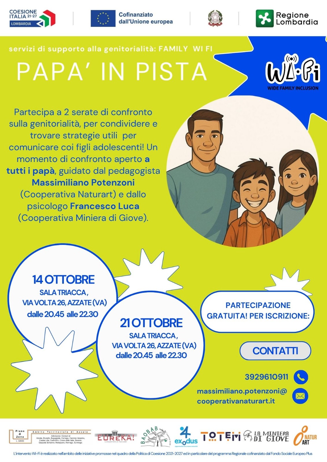L’iniziativa rientra all’interno del progetto “WI-FI: Wide Family Inclusion” dedicato alle famiglie con figli della fascia 3-18 anni e che punta a offrire gratuitamente occasioni educative, culturali, didattiche e formative per figli e genitori, con una varietà di proposte davvero diversificata e alla portata di tutti.