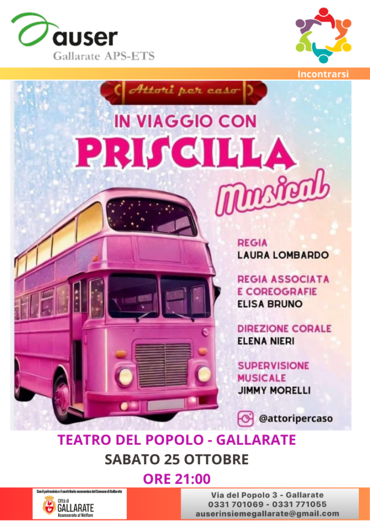 Sabato 25 ottobre, alle ore 21, il Teatro del Popolo di Gallarate ospiterà un gradito ritorno: la compagnia “Attori per Caso” di Busto Arsizio porterà in scena il musical “In viaggio con Priscilla”, liberamente tratto dal celebre film e musical Priscilla, la Regina del deserto. Questo spettacolo, interamente cantato dal vivo, promette di essere un’occasione imperdibile per gli amanti del musical e per chi vuole contribuire a una causa importante.