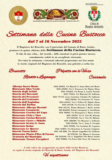 Come sempre, la manifestazione prenderà il via dopo il Dì dei Bruscitti, tradizionalmente fissato per il primo giovedì di novembre e in programma a Malpensafiere. Lì protagonista sarà il piatto simbolo di Busto Arsizio, servito in occasione della grande serata conviviale per cui le iscrizioni sono già aperte (iscrizioni@magisterodeibruscitti.org).