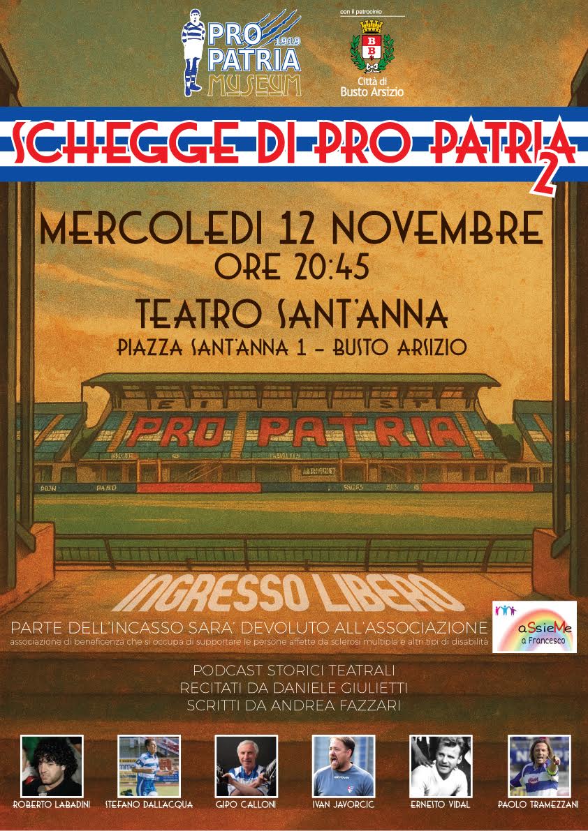 La passione per la maglia biancoblù torna al Teatro Sant’Anna. Mercoledì 12 novembre alle 20.45 si terrà “Schegge di Pro Patria 2”, una serata che unisce calcio, teatro e solidarietà, organizzata dal Pro Patria Museum.