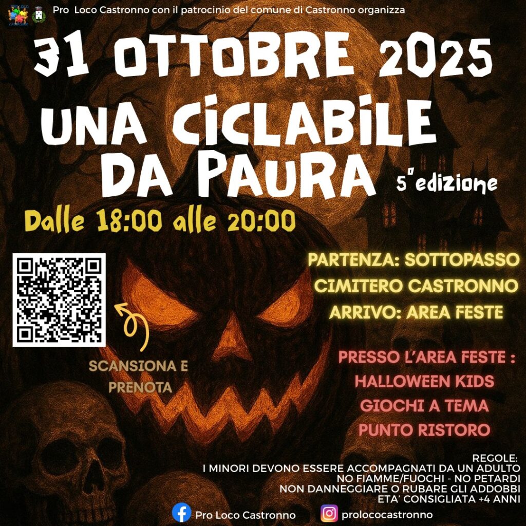 La Pro Loco di Castronno dà appuntamento venerdì 31 ottobre a grandi e piccoli per la quinta edizione della “Ciclabile da Paura”. La partenza è prevista dal sottopasso del cimitero, con arrivo all’area feste del paese.