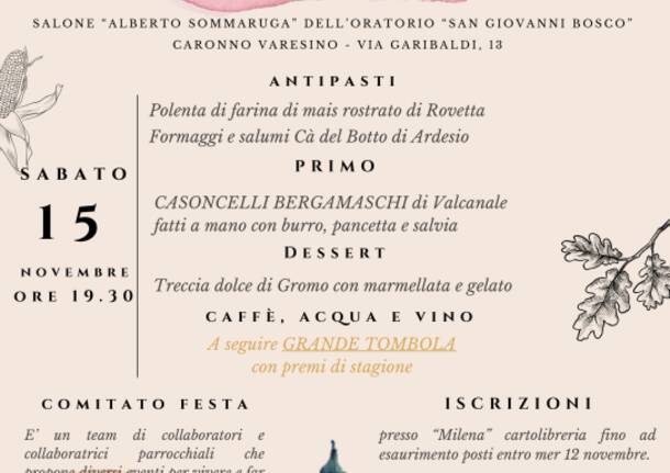 Il Comitato Festa della parrocchia di Caronno Varesino propone anche quest’anno la famosa CENA D’AUTUNNO. Sapori, odori e gusti di stagione, quest’anno con una fantasia in più: tutti cibi provenienti dalla bergamasca.