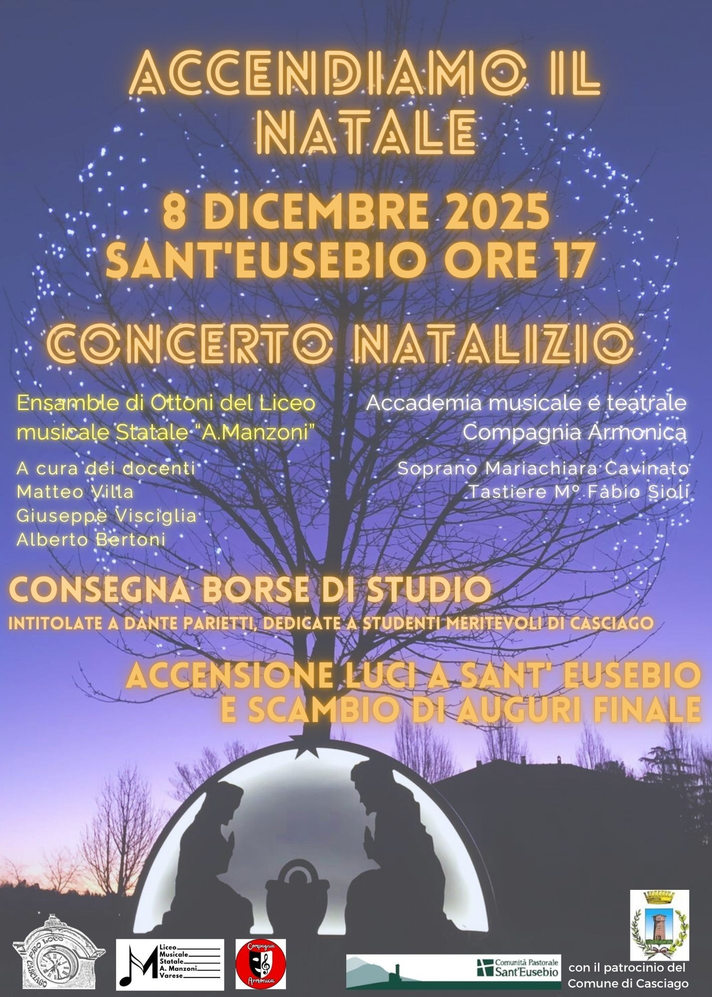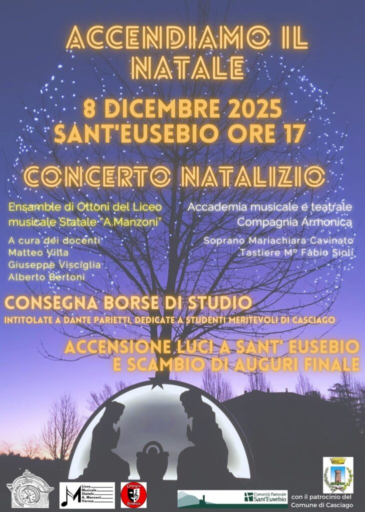 Il Natale a Casciago inizia con le note della musica e la luce della condivisione. Domenica 8 dicembre 2025, alle ore 17, la comunità si riunirà a Sant’Eusebio per l’iniziativa “Accendiamo il Natale”, un evento organizzato dalla Pro Loco in collaborazione con la Comunità Pastorale Sant’Eusebio, con il patrocinio del Comune di Casciago.