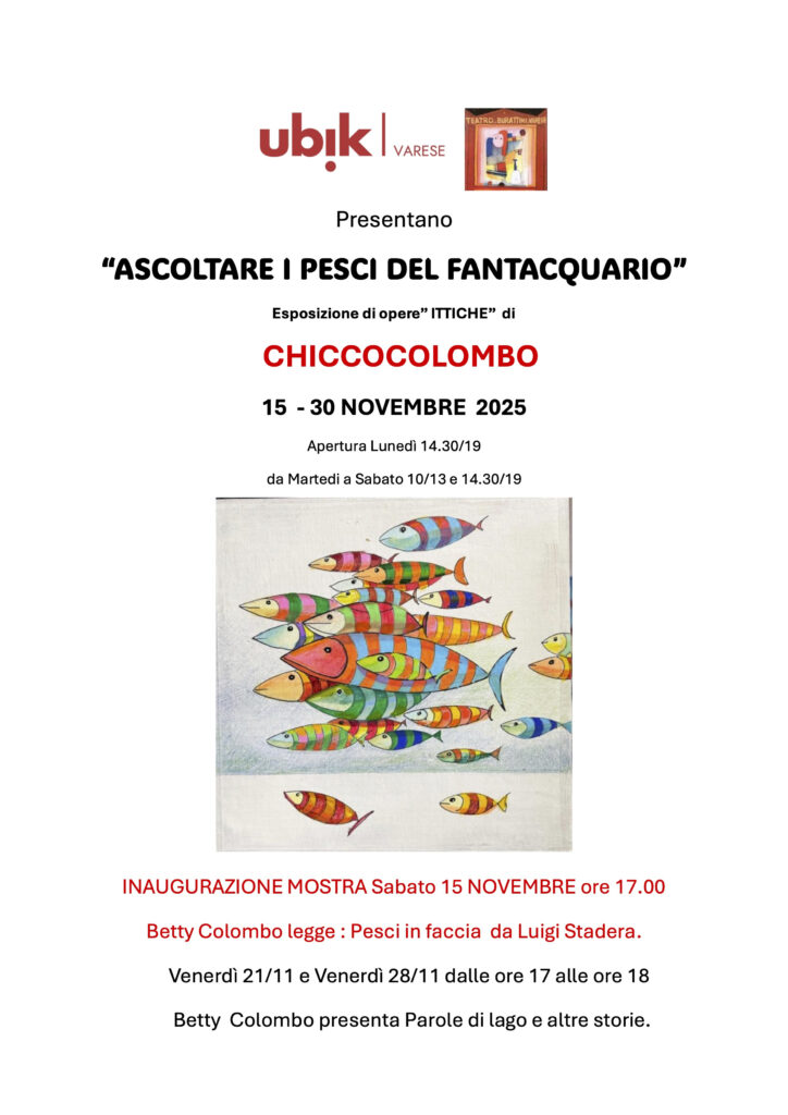 Un’esplosione di colori, immaginazione e ironia: sono gli ingredienti della nuova mostra “Ascoltare i pesci del Fantacquario”, esposizione di opere “ittiche” firmate dal celebre illustratore Chicco Colombo, che verrà inaugurata sabato 15 novembre alle ore 17 presso la Libreria Ubik di piazza del Garibaldino a Varese.