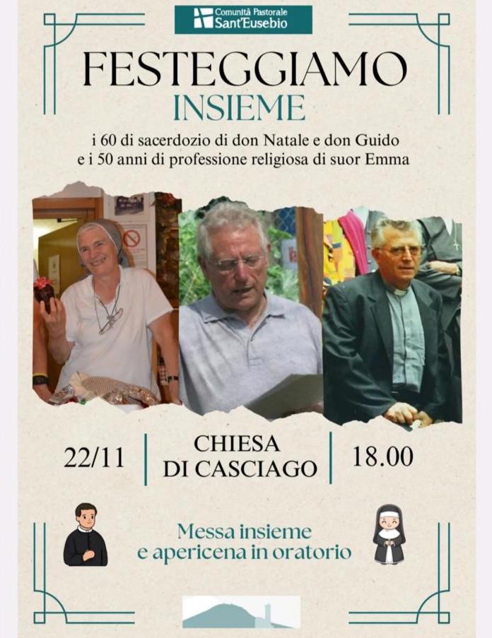 Una serata di festa e gratitudine attende la comunità pastorale di Sant’Eusebio, che si prepara a celebrare un triplice anniversario di grande significato spirituale e umano: i 60 anni di sacerdozio di don Natale e don Guido, e i 50 anni di professione religiosa di suor Emma.