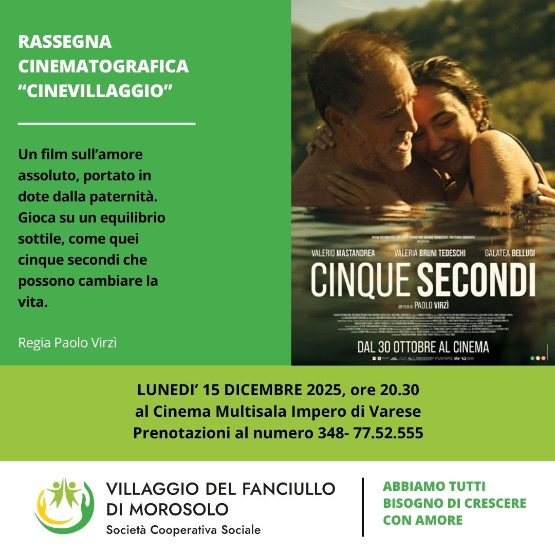Torna Cinevillaggio, la rassegna cinematografica solidale organizzata a sostegno del Villaggio del Fanciullo di Morosolo. L’appuntamento è per lunedì 15 dicembre alle ore 20.30 al Multisala Impero di Varese, con la proiezione del film “Cinque Secondi” diretto da Paolo Virzì.