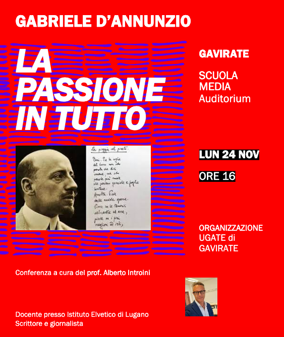 Un appuntamento culturale di grande fascino e attualità attende il pubblico lunedì 24 novembre alle ore 16, presso le scuole medie di Gavirate. A salire in cattedra sarà il professor Alberto Introini, docente di Letteratura italiana e Storia contemporanea presso l’Istituto Elvetico di Lugano, per una conferenza dal titolo: “Gabriele D’Annunzio: la passione in tutto”.