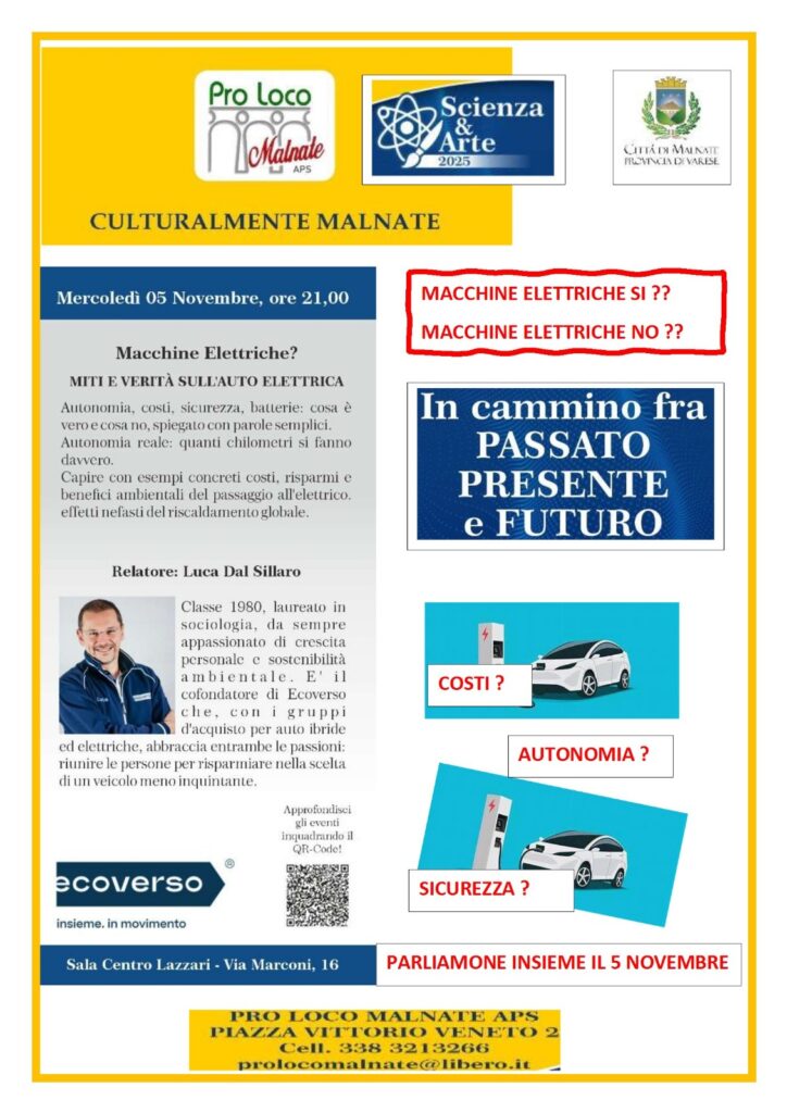 La rassegna Culturalmente Malnate, promossa dalla Pro Loco Malnate APS con il patrocinio del Comune di Malnate, propone un nuovo incontro dedicato a uno dei temi più attuali del nostro tempo: la mobilità elettrica.