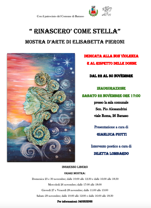Sarà la sala comunale “Sen. Pio Alessandrini” di Barasso, in viale Roma 26, a ospitare la mostra d’arte “Rinascerò come stella”, personale dell’artista Elisabetta Pieroni, dedicata al tema della non violenza e del rispetto delle donne. L’esposizione, patrocinata dal Comune di Barasso, si terrà dal 22 al 30 novembre.