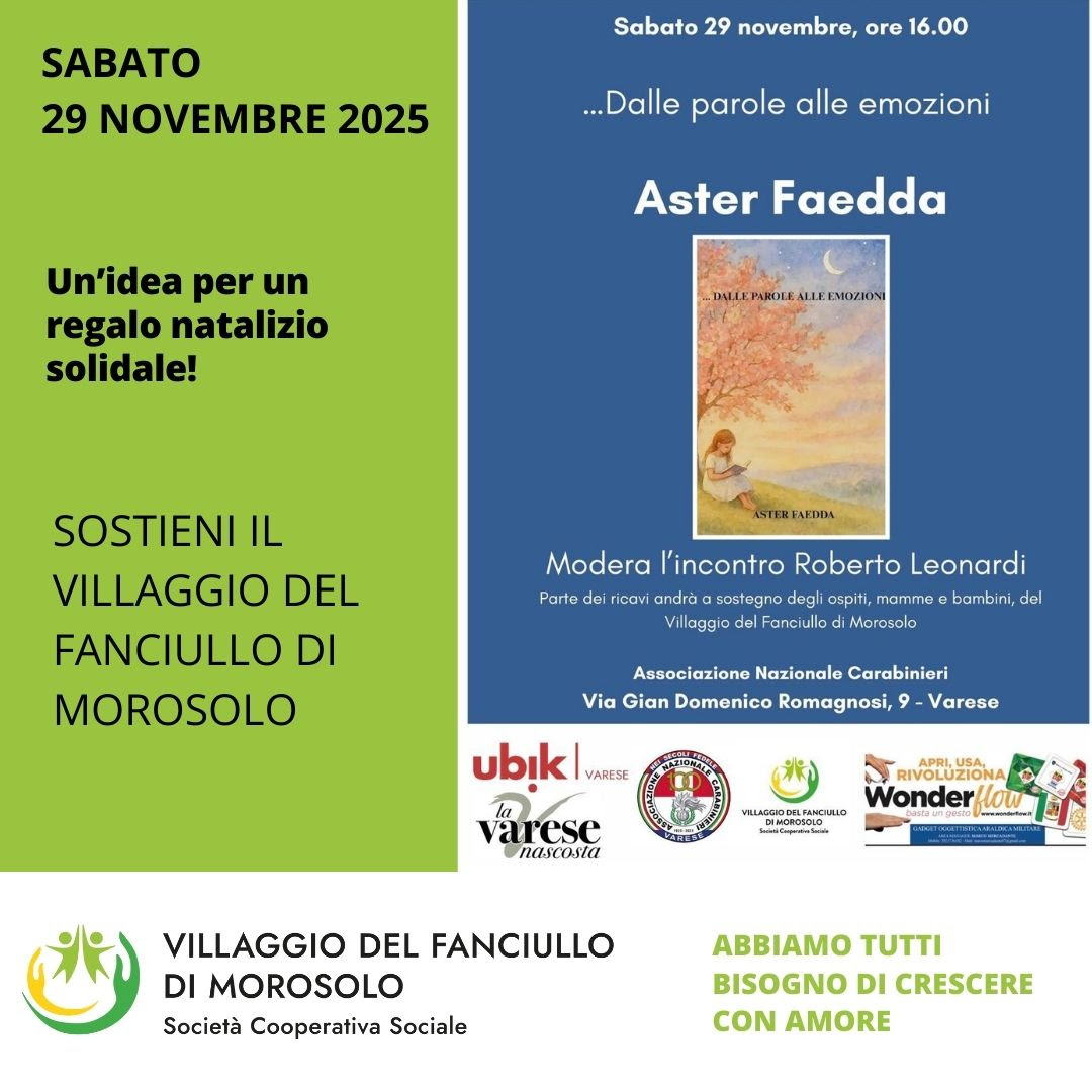 L’incontro, che sarà moderato da Roberto Leonardi, è un’occasione per immergersi in un viaggio tra scrittura e sentimento, ma anche per offrire un aiuto concreto: parte dei ricavi della vendita del libro sarà infatti devoluta al Villaggio del Fanciullo di Morosolo, realtà impegnata nell’accoglienza e nel sostegno a mamme e bambini in difficoltà.