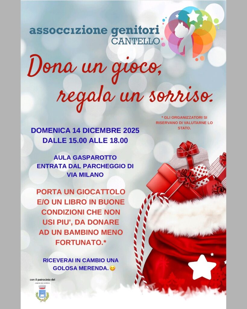 L’Associazione Genitori Cantello, con il patrocinio del Comune di Cantello, rinnova anche quest’anno l’invito a partecipare a un gesto semplice ma dal grande valore umano: donare un gioco o un libro che non si usa più per far felice un bambino che ne ha bisogno.