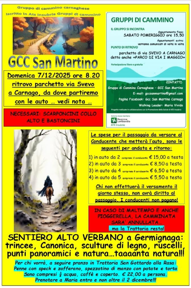 Il Gruppo di Cammino Carnaghese GCC San Martino propone una camminata libera e gratuita, aperta a tutti. L’appuntamento è fissato per domenica 7 dicembre alle ore 8.20, con ritrovo al parchetto di via Svevo a Carnago. Da lì si partirà insieme alla volta del Sentiero Alto Verbano, nel territorio di Germignaga, un percorso noto per l’atmosfera suggestiva e gli scorci naturali di grande fascino.