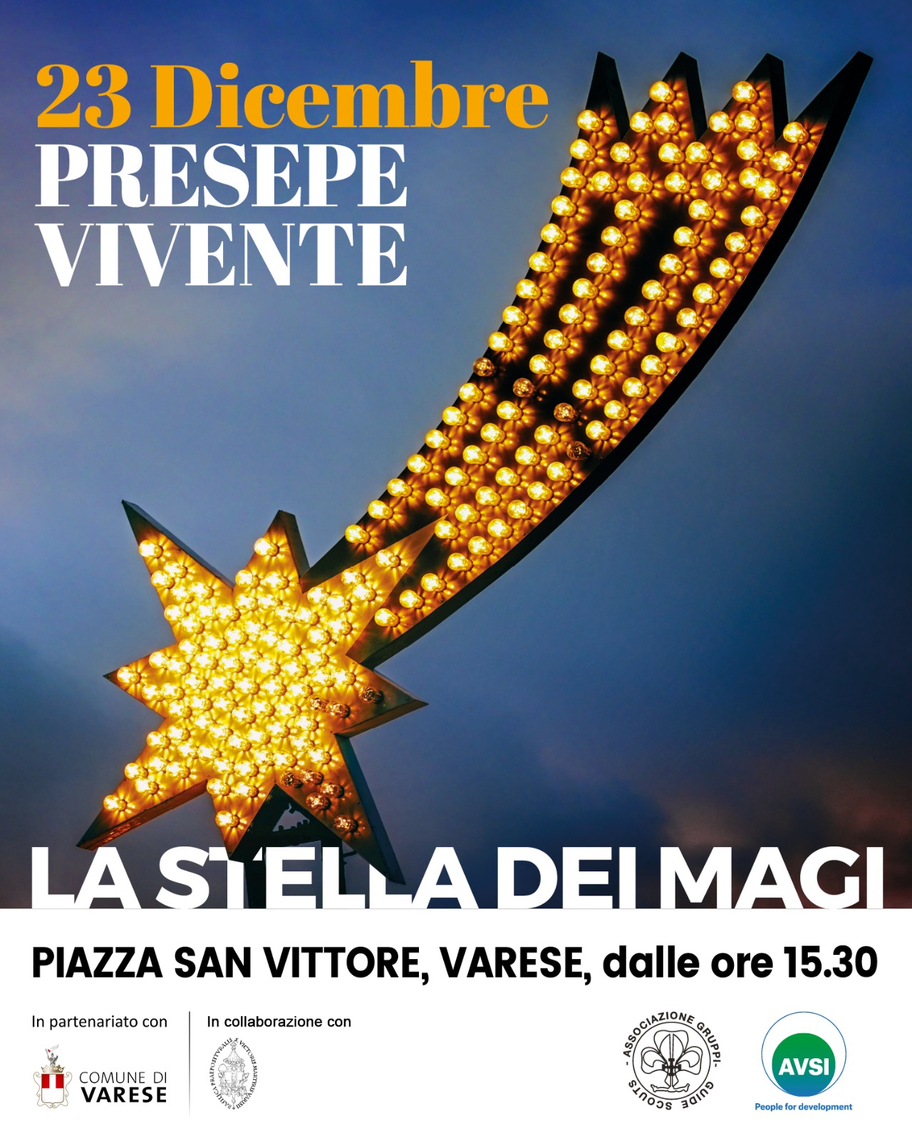 Il titolo scelto per questa edizione è “La Stella dei Magi”, una sacra rappresentazione che si terrà alle 17.00 e che racconterà il Mistero della Natività dal punto di vista dei Re Magi, uomini in cammino alla ricerca del senso ultimo della vita. A guidarli sarà un Angelo, che li condurrà – insieme al pubblico – verso la cometa, simbolo della luce vera che brilla nel buio.