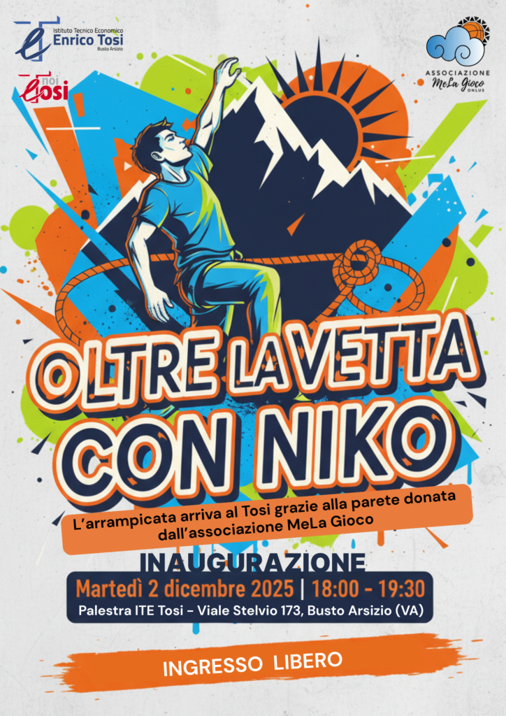 Martedì 2 dicembre 2025, dalle 18:00 alle 19:30, presso l’ITE Tosi (Viale Stelvio 173, Busto Arsizio), si terrà l’inaugurazione ufficiale della nuova parete di arrampicata, donata all’istituto dall’Associazione MeLa Gioco.