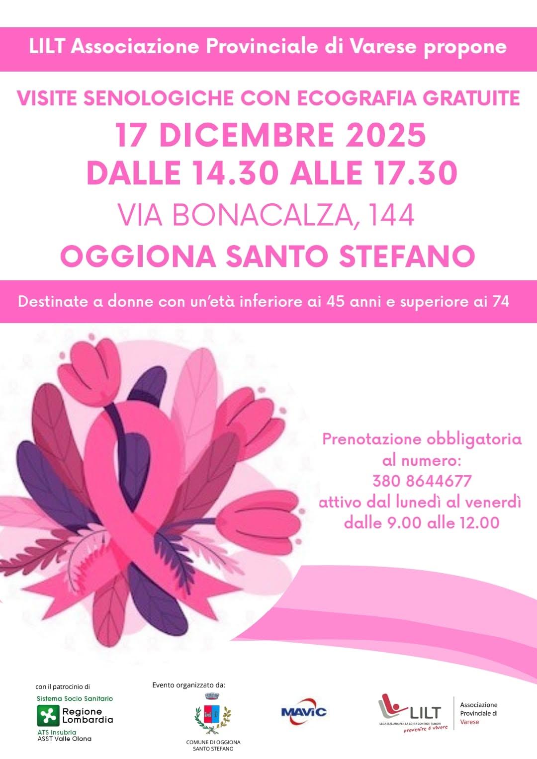 Il Comune di Oggiona con Santo Stefano, insieme alla LILT – Associazione Provinciale di Varese, organizza per mercoledì 17 dicembre 2025 un pomeriggio dedicato alla prevenzione senologica, offrendo visite con ecografia completamente gratuite