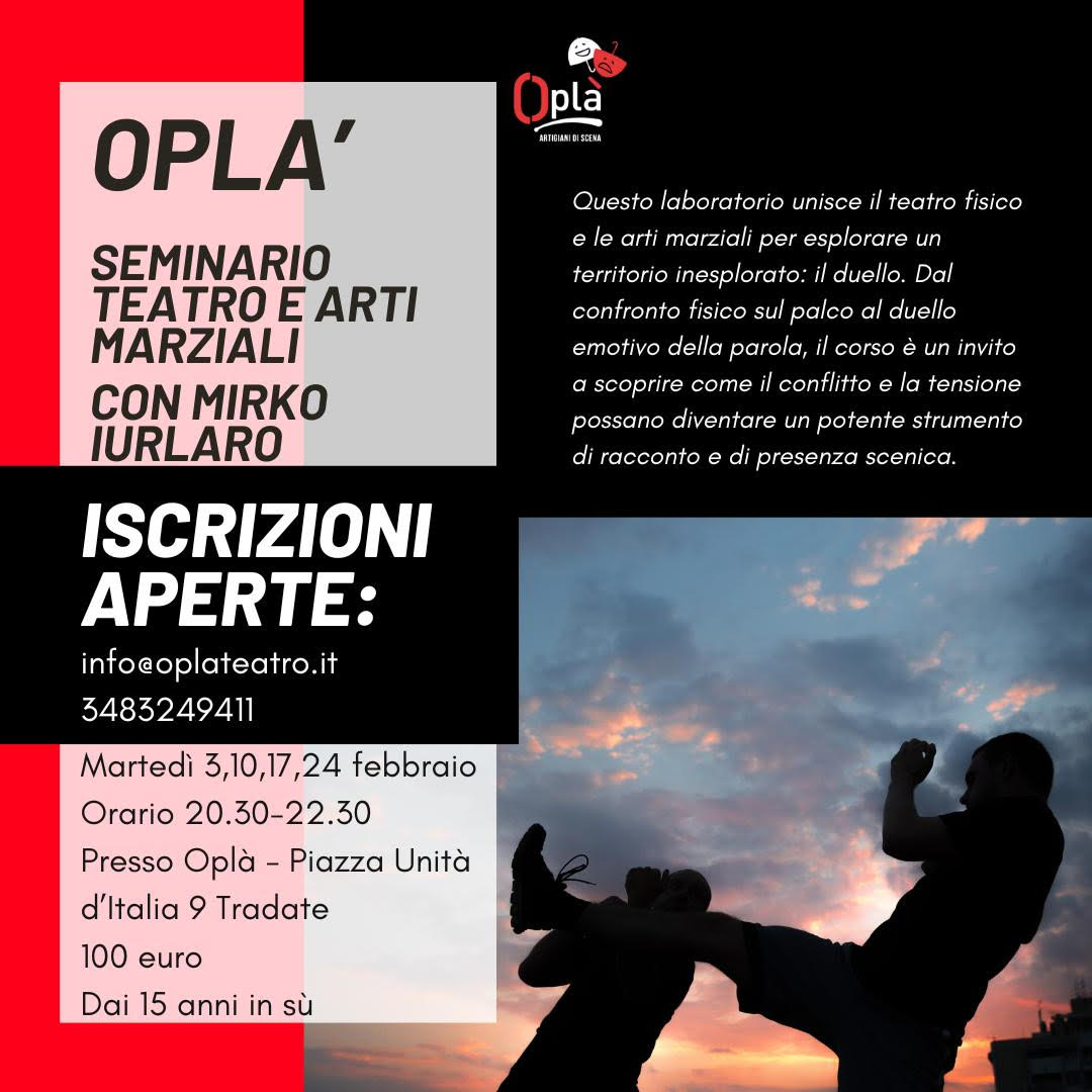 Oplà teatro presenta una singolare idea regalo per Natale: una nuova serie di seminari dedicati alla formazione teatrale, pensati per allievi e attori dai 15 anni in su, anche senza esperienza. Tre percorsi complementari (Teatro e Arti Marziali, La Maschera e Mimo) guidati da professionisti del settore, per esplorare il rapporto tra corpo, emozione e presenza scenica. Tutti i corsi si terranno presso Oplà, in Piazza Unità d’Italia 9, Tradate, con un numero limitato di partecipanti. Per avere informazioni scrivere a info@oplateatro.it oppure visita il sito di Oplà.