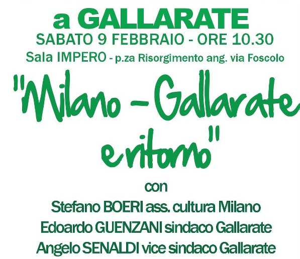 "Milano-Gallarate e ritorno". E' il titolo dell'incontro in programma sabato 9 febbraio a Gallarate organizzato da Alessandro Alfieri, consigliere regionale PD e ricandidato, con Stefano Boeri, assessore alla Cultura del Comune di Milano e Edoardo Guenzani, sindaco di Gallarate.