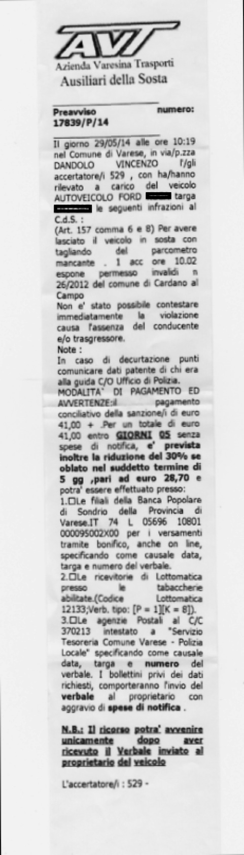 questa mattina ho parcheggiato in Varese, vicinanze tribunale, su strisce blu, in mancanza di parcheggi invalidi liberi e mi è stata fatta la multa dopo pochi minuti che aveva parcheggiato.