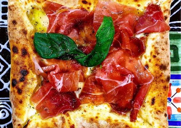 Erice: mattonella con scamorza affumicata, crudo di Parma e rosmarino. Bordi ripieni di crema di zucca e porri. Fine cottura pepe e basilico fresco