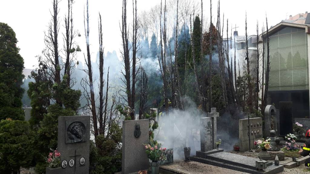 I vigili del fuoco sono intervenuti per spegnere le fiamme che hanno devastato quattro cipressi all’interno di uno dei campi