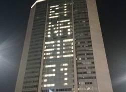 Pirellone illuminato con la scritta “Binario 21”